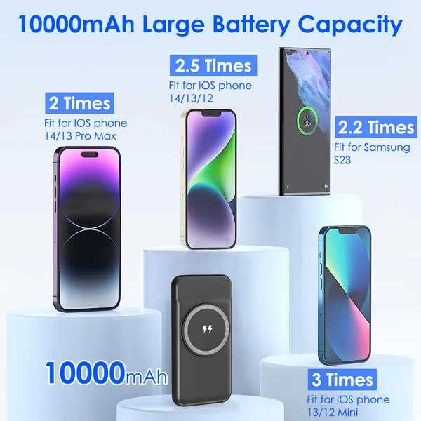 This 10000mAh magnetic wireless power bank gives you fast and easy charging wherever you go. The strong magnetic design snaps to the back of your phone so it stays in place. You get 15W wireless charging, PD fast charging, QC fast charging, and a built-in Type-C cable. It can charge up to four devices at the same time, making it great for travel, school, work, or outdoor activities.