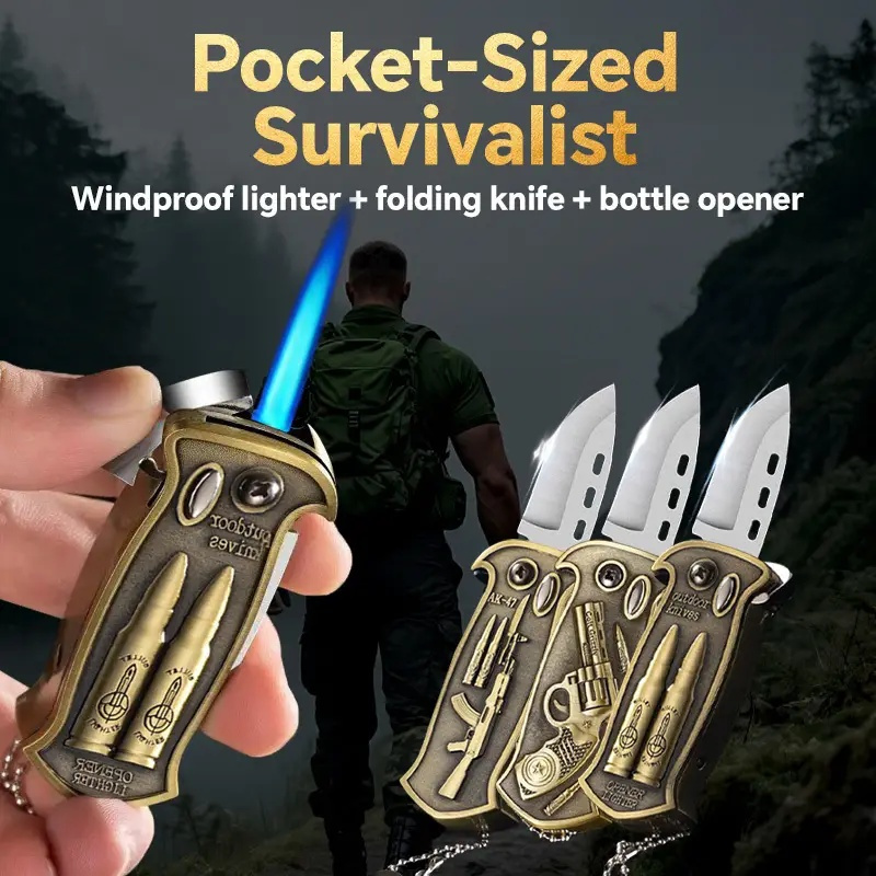 The Military Style Butane Lighter is a rugged, 3-in-1 survival tool designed for outdoor reliability and everyday utility. This versatile lighter combines an adjustable windproof flame, a built-in bottle opener, and a metal edge for prying or scraping — making it a must-have for your camping kit, bug-out bag, or glovebox.