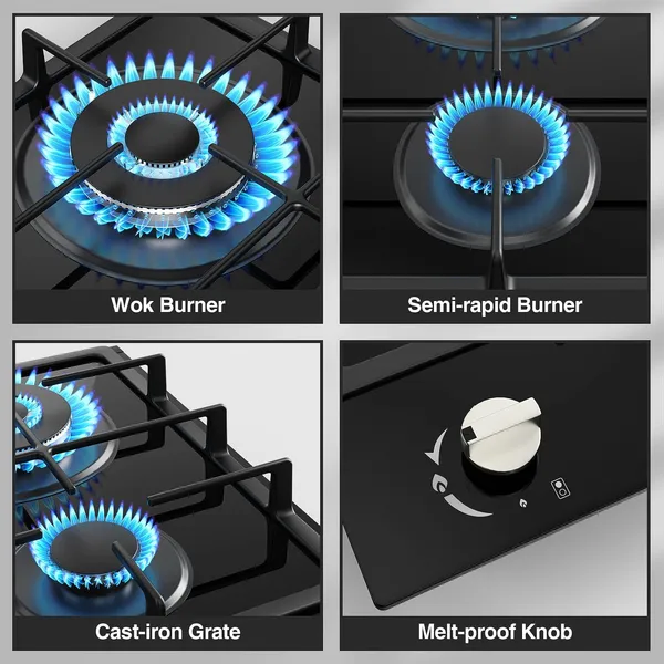 The tempered glass surface looks clean and is easy to wipe. Cast-iron grates support your pans, and the built-in thermocouple protection helps keep your home safe by shutting off gas if the flame goes out.