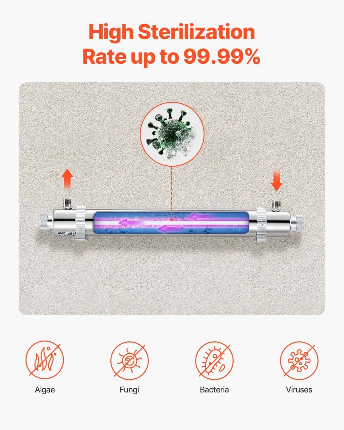 The VEVOR 110V 25W UV Water Purifier delivers powerful, chemical-free sterilization for homes, RVs, aquariums, and off-grid systems. Its stainless-steel chamber and high-efficiency UV lamp destroy bacteria, viruses, and microorganisms instantly—providing fresh, safe water without changing its taste or pH.