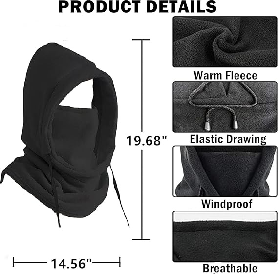 • Can be worn several ways (hat, neck warmer, balaclava)
